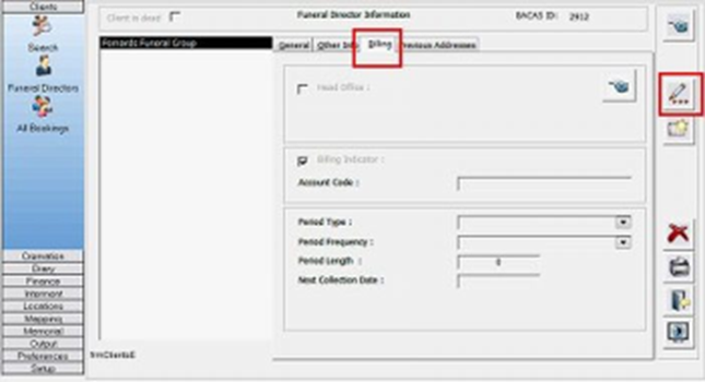 The Funeral Director Information screen will be displayed. Select the Billing Tab and click on the Edit pencil Click on the Finger adjacent to Head Office |