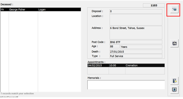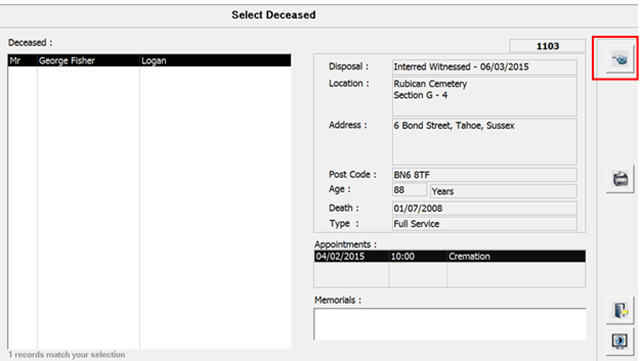 The Selected Deceased screen will be displayed Click on the Selection Finger to open the cremation record |