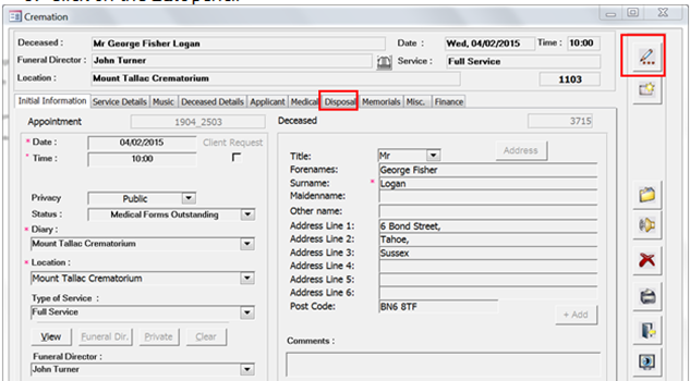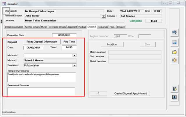 NOTE: If you wish to create a disposal appointment from the cremation record, follow these notes: Create A Disposal Appointment From the Cremation Record