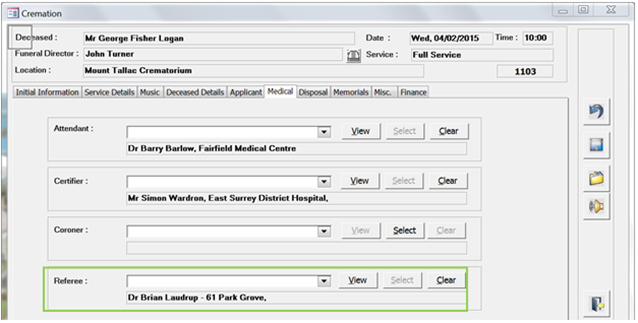 You will be returned to the Medical tab for the cremation record and the Medical Referee will be displayed.