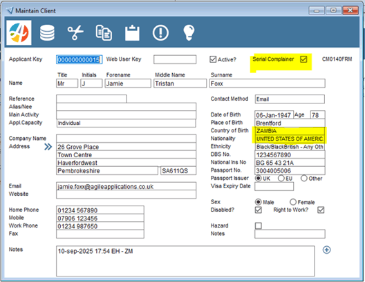 There are new fields available in the client area for country of birth, nationality and serial complainer.