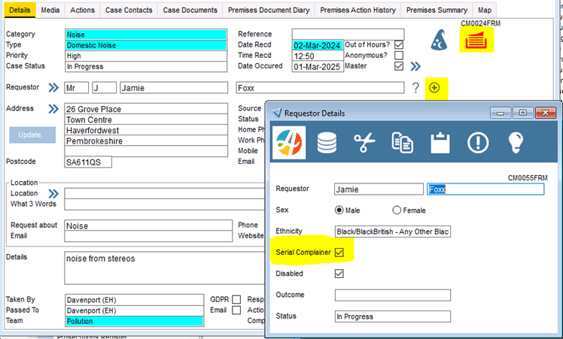 Serial complainer, when switched on a client will, when the client is selected for a RFS, populate the serial complainer field in the RFS, found under the extra details tab, and display an icon in the top right-hand corner of the main RFS screen.
