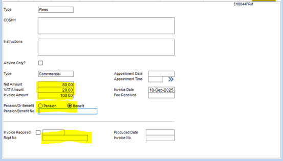 These rates are applied in the RFS pest control extra details tab and are triggered by location address and by selecting either ‘pension’ or ‘benefit’ in the radio button.