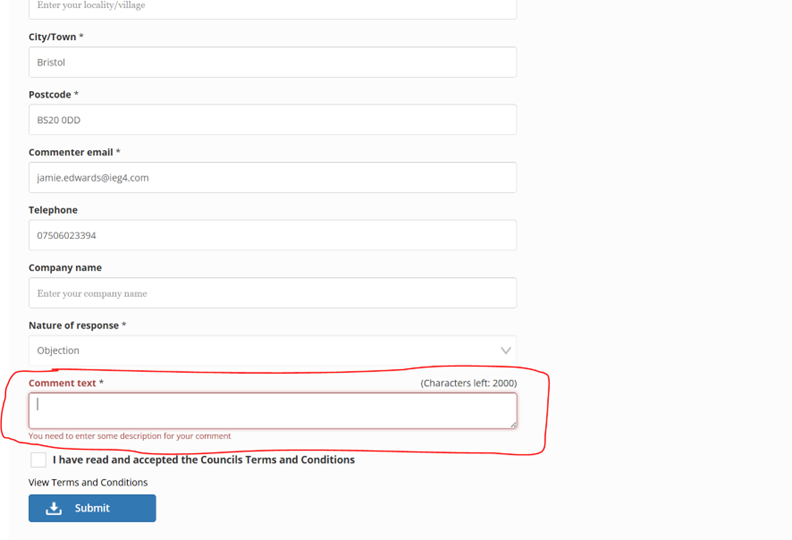 Citizen Portal Planning Comment Text Field: