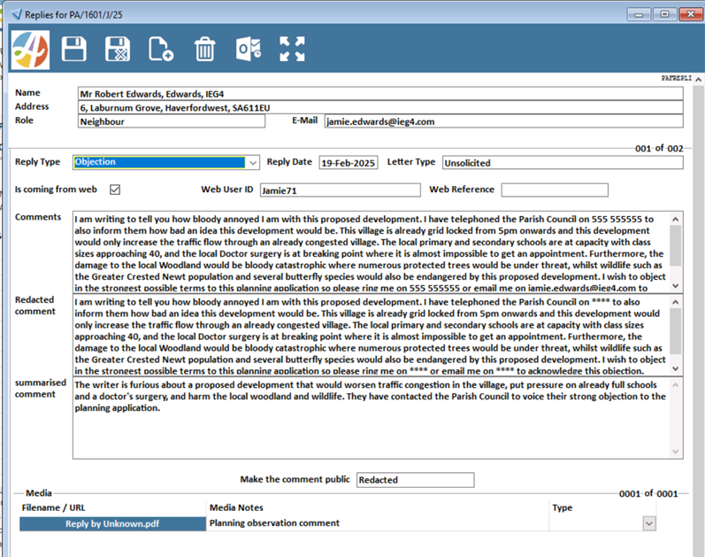 Additionally, the Planning system now supports automatic redaction and summarisation of submitted comments (provided they are entered in the ‘Comment Text’ field when submitted via the Citizen Portal) while retaining the original text. Once the consultation period concludes, planners can generate a consolidated summary of all responses via the ‘Replies’ screen, which can be merged into the Planner report. This functionality is powered by integrated AI technology, which is disabled by default but can be activated upon request through the Support Desk or your Account Manager.